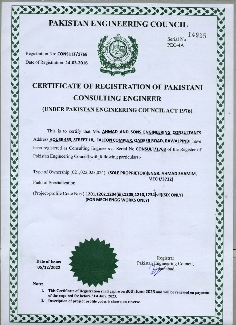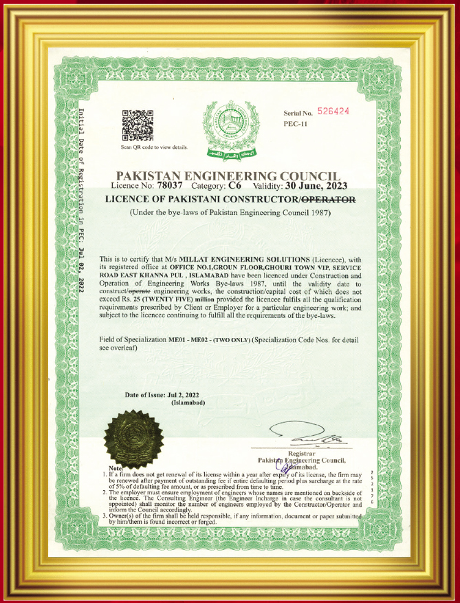 Millat Consultants operates with full professional responsibility and regulatory compliance through its registration with the Pakistan Engineering Council (PEC) under the name Ahmad & Sons Engineering Consultants.